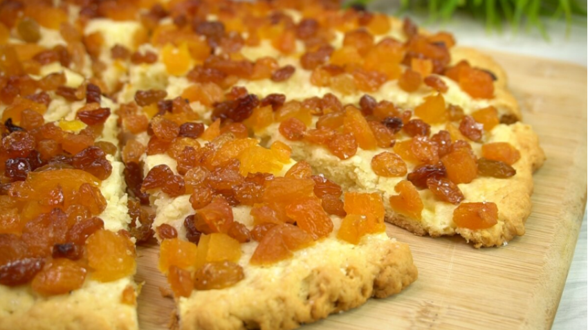 После того как тесто остыло, его выкладывают на противень, предварительно застеленный бумагой для выпечки. Формируют круг диаметром около 25 см и аккуратно подправляют края. Сверху щедро посыпают изюмом и курагой, немного сахара для сладости. Для создания треугольных коржиков можно нарезать тесто заранее.