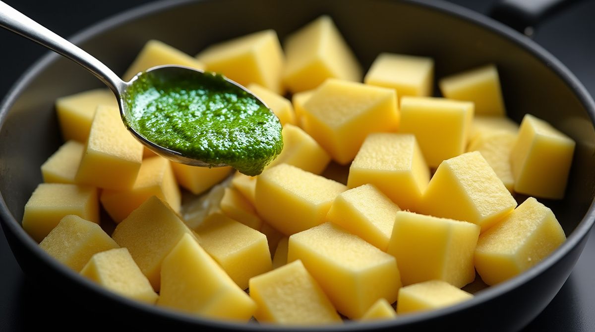 Неожиданная подача может превратить привычное блюдо в маленькое приключение на тарелке. Густое пюре, аккуратно сформированное лопаткой и завершённое запеканием, превращается в воздушное печенье с зелёной серединой из песто. Эта деталь делает блюдо заметным и запоминающимся, даже если стол сервирован просто.