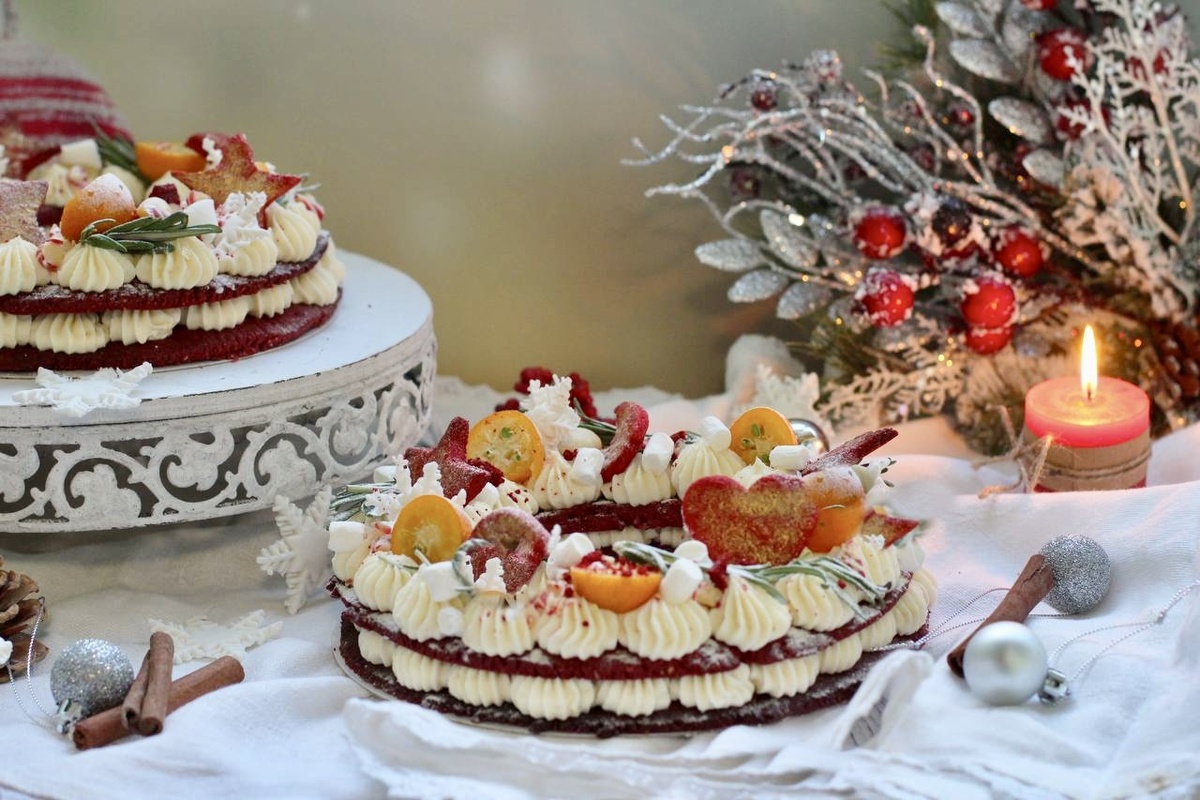 4. Декор и завершение: Подготовьте кумкваты, розмарин и маршмеллоу. Уложите их на верхний корж, не перегружая декор, чтобы крем не сплющился. По желанию, сделайте снежинки из мастики.