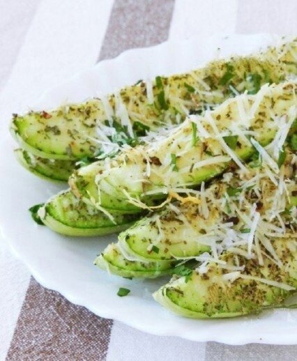 Перед подачей переложите кабачки на тарелку, посыпав мелко нарезанной петрушкой и еще немного натертым сыром.