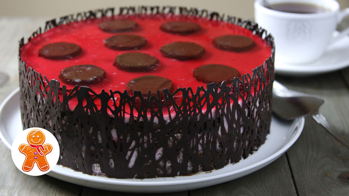 После заливаем торт желе и хорошо охладим. Для украшения можно использовать шоколадную ленту, сделанную из растопленного шоколада, что придаст торту нарядный вид.