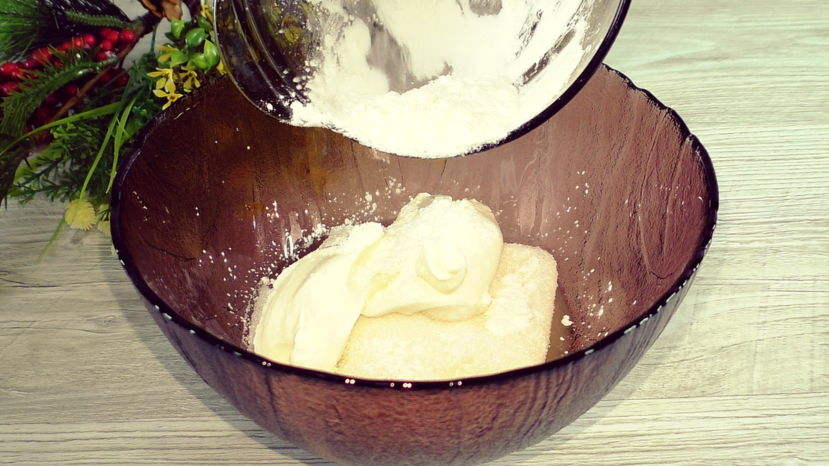 Для начала следует сделать творожную заливку: смешайте творог, яйцо и сахар, затем добавьте сметану и крахмал. Взбейте все до однородной массы при помощи блендера.
