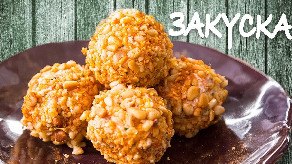 Теперь дело за формированием шариков. Из небольшого количества получившегося паштета руками формируются кружочки. В центр каждого помещается оливка без косточки, затем шарик обваливается в панировке из орехов. Прекрасно оформленные закусочные шарики выкладываются на тарелку, и процесс повторяется с оставшимся паштетом.