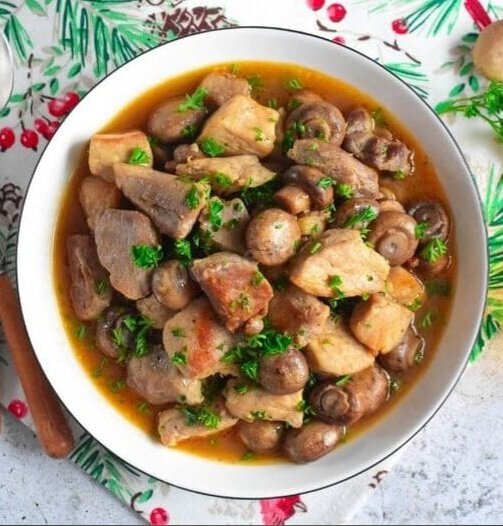 Верните на сковороду грибы, влейте яблочный сок, приправьте паприкой, солью и перцем. Перемешайте все ингредиенты и тушите под крышкой на слабом огне 10-15 минут, пока мясо не станет мягким.