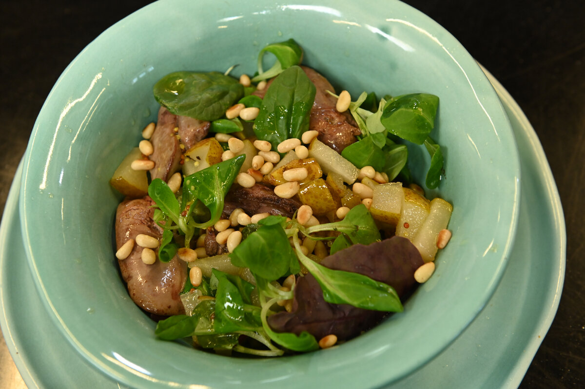 Груши нарезать небольшими дольками.На сковороде растопить сливочное масло с сахаром. Выложить груши и обжаривать до тех пор, пока они не станут прозрачными. После этого готовую карамель отложить в отдельную миску.Для заправки смешать оливковое масло, сок лимона, дижонскую горчицу и мед.Кедровые орехи немного обжарить на сковороде без масла.Куриную печень вымыть, обсушить, удалить пленки и жир. Нарезать крупно.На раскалённую сковороду налить смесь оливкового и растительного масла, выложить кусочки печени, обжарить до готовности с обеих сторон. В конце приготовления добавить коньяк и оставить на минуту.Выбрать глубокую тарелку, уложить на дно микс-салат, затем печень, чередуя с карамелизированными грушами и другими ингредиентами. Полить заправкой и посыпать кедровыми орехами. Приятного аппетита!