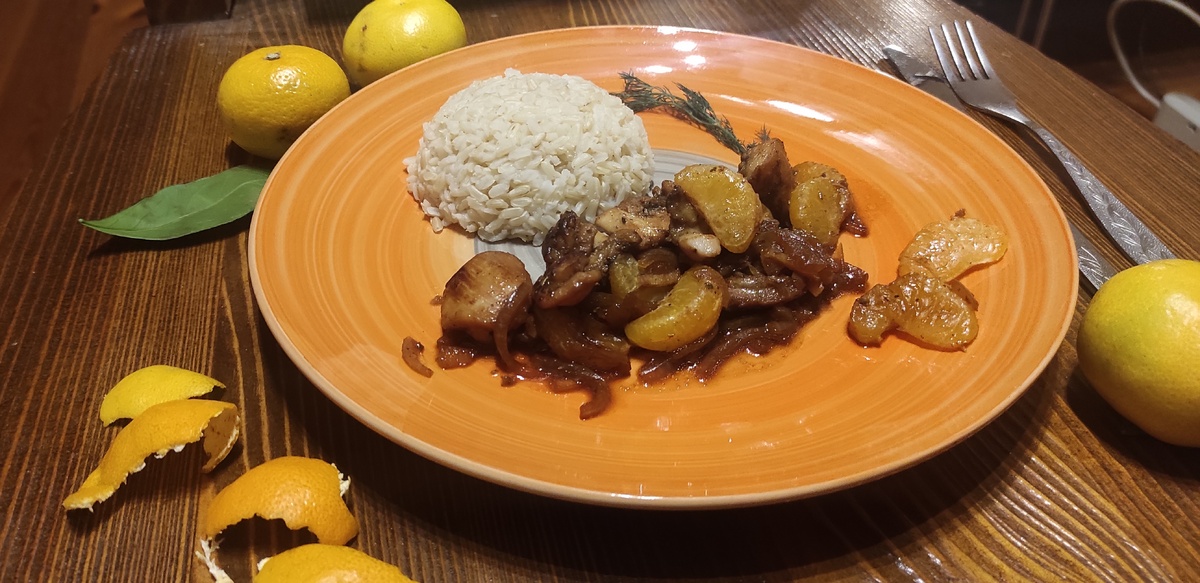 Подавать блюдо рекомендуем с отварным бурым рисом, который прекрасно дополняет сладко-кислый вкус куриного филе с мандаринами. Приятного аппетита и волшебного новогоднего настроения!