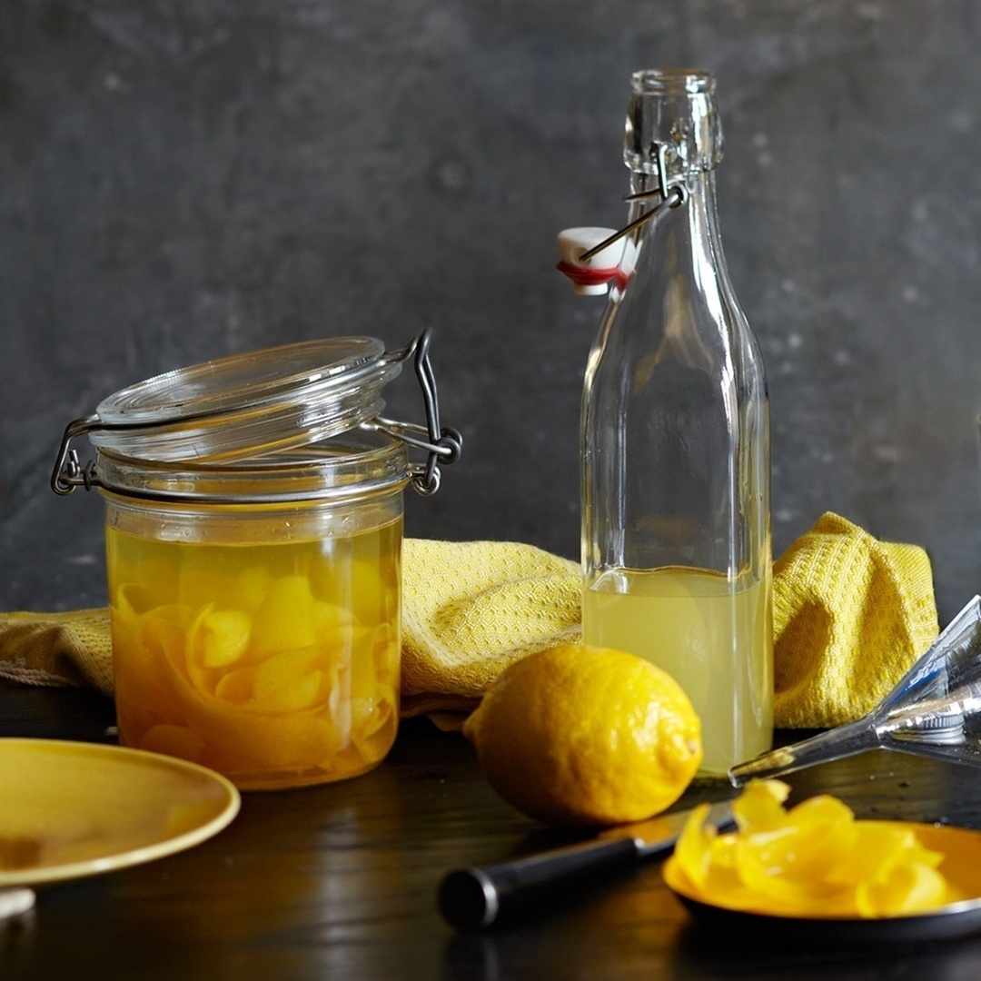 Острыми ножом или специальным инструментом аккуратно снимите желтую кожуру, избегая белой прослойки. Нарезанные полоски поместите в чистую стеклянную емкость и залейте алкоголем. Закройте крышкой и уберите в темное место на 7-10 дней, периодически взбалтывая содержимое. Готовым настоем должен стать жидкости с глубоким золотистым оттенком и насыщенным лимонным ароматом.