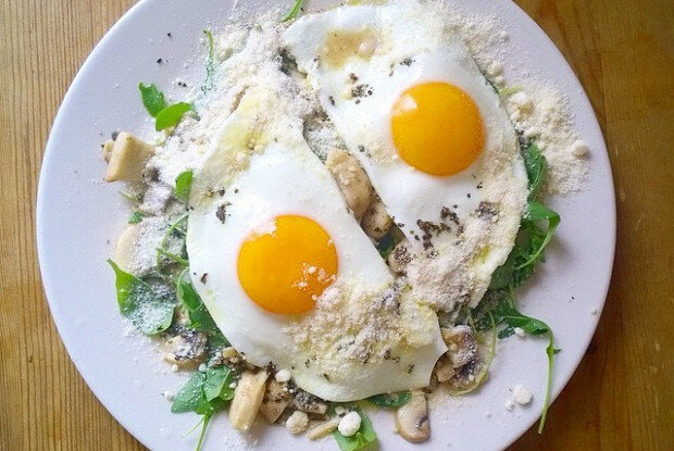 Это отличный выбор для сторонников белковой диеты: богатый вкус грибов смягчается яичным белком, а насыщенный желток придает салату легкий и изысканный соус.