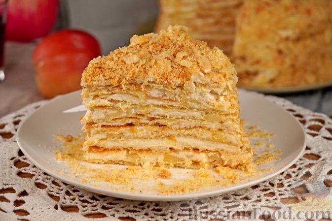 - Торт "Наполеон" с яблоками - Этот классический десерт можно сделать еще более интересным, добавив в заварной крем кусочки свежих яблок. Коржи из теста на сметане можно приготовить с использованием маргарина, что сделает их более воздушными и хрустящими.