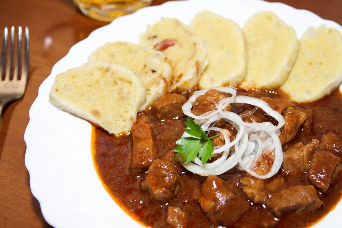 Подавайте гуляш на больших тарелках, выложив мясо с обильной подливой в центре, а кнедлики по краям. Украсить блюдо тонко нарезанным репчатым луком — отличная идея! Не забудьте налить кружку холодного пива для полного счастья.