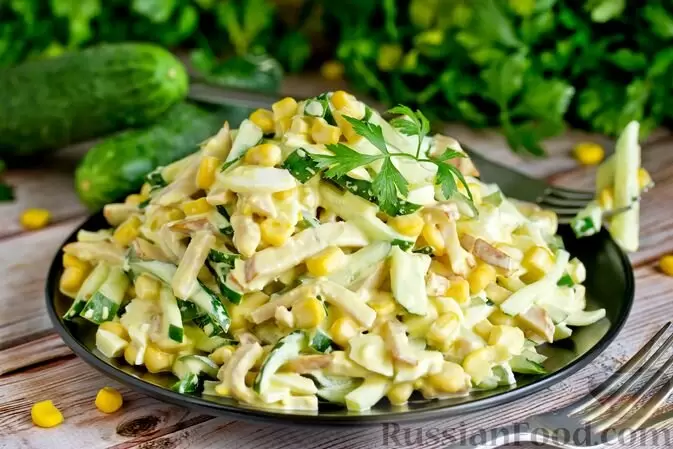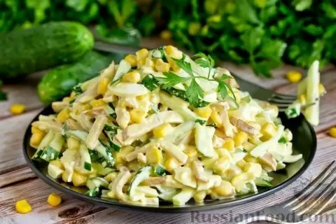 - Ингредиенты: куриное филе, огурцы, капуста белокочанная, кукуруза консервированная, молоко, растительное масло, яйца, чеснок, майонез, соль, чёрный молотый перец.