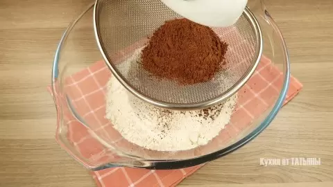 - Предварительно просеянную муку смешать с какао. Это поможет избежать комочков и сделать десерт более воздушным.