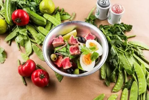 5. Завершите блюдо, украсив сверху разломленными яйцами и порванным тунцом. Добавьте свежесрезанную петрушку и дольку лайма. Не забудьте sprinkle немного свежемолотого перца на желток для аромата.