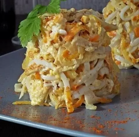 Блюдо готово к подаче! Салат с кальмарами и блинами порадует даже самых взыскательных гурманов. Приготовьте его и удивите своих близких.