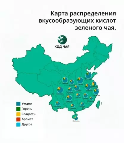 Марат Тухватшин опубликовал в «Чайной Науке» увлекательную карту, которая визуализирует распределение аминокислот в популярных чайных провинциях Китая. На этой карте представлены диаграммы, показывающие доли аминокислот, ответственных за горечь, умами, сладость и аромат зеленых чаев. Как показала работа, такая компоновка делает познание китайского чая более доступным для потребителя, а не требует глубокого, иногда трудного осознания всей культуры.