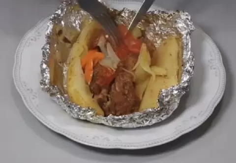 После подготовки всех компонентов, на кусках фольги выкладываем овощи, легонько присыпаем их специями, затем добавляем ребрышки и пару ложек маринада. Заворачиваем фольгу конвертом и укладываем заготовки на противень. Затем противень помещаем в предварительно разогретую до 200 градусов духовку. Время запекания составляет примерно 1,5 часа. Подавайте блюдо горячим, дабы насладиться уникальным сочетанием ароматного мяса и гарнира.