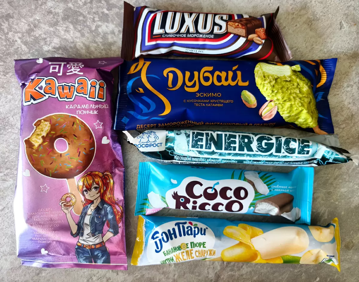 Некоторые продукты, как эскимо с хрустящим тестом катаифи, не оправдали ожиданий. За 79 рублей ощущается дешевизна, несмотря на многообещающие ингредиенты. Глазурь явно содержит много растительных жиров, что оставляет желать лучшего. Переключившись на фруктовый лед с ароматизатором "Energice" за 41,50 рубля, можно ощутить сладость и вкус, но ощутимость энергетика быстро растворяется в сладкой воде и становится водянистым.