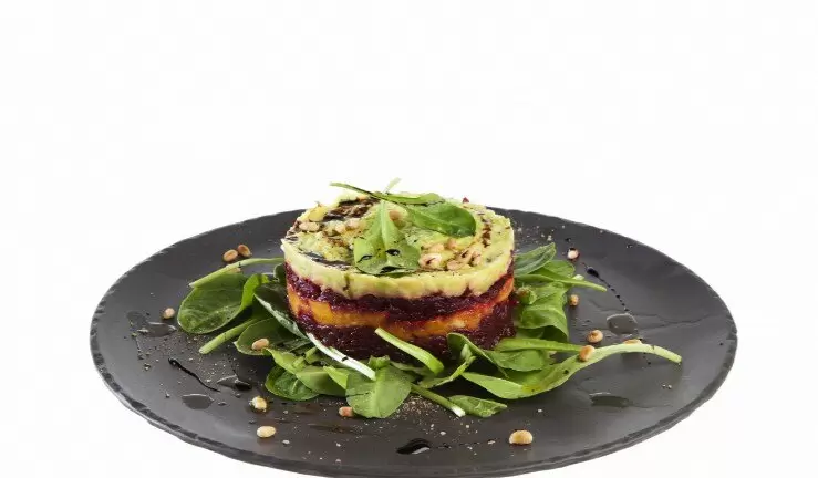 Теперь настало время сервировки! На тарелку выложите свежие листья шпината, затем аккуратно через кулинарное кольцо выложите слоями приготовленные ингредиенты. Начните со свеклы, затем добавьте тыкву, снова свеклу, и завершите слоем авокадо. Посыпьте салат оставшимися кедровыми орехами и придайте ему изысканный вид, украсив бальзамическим кремом.