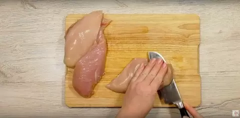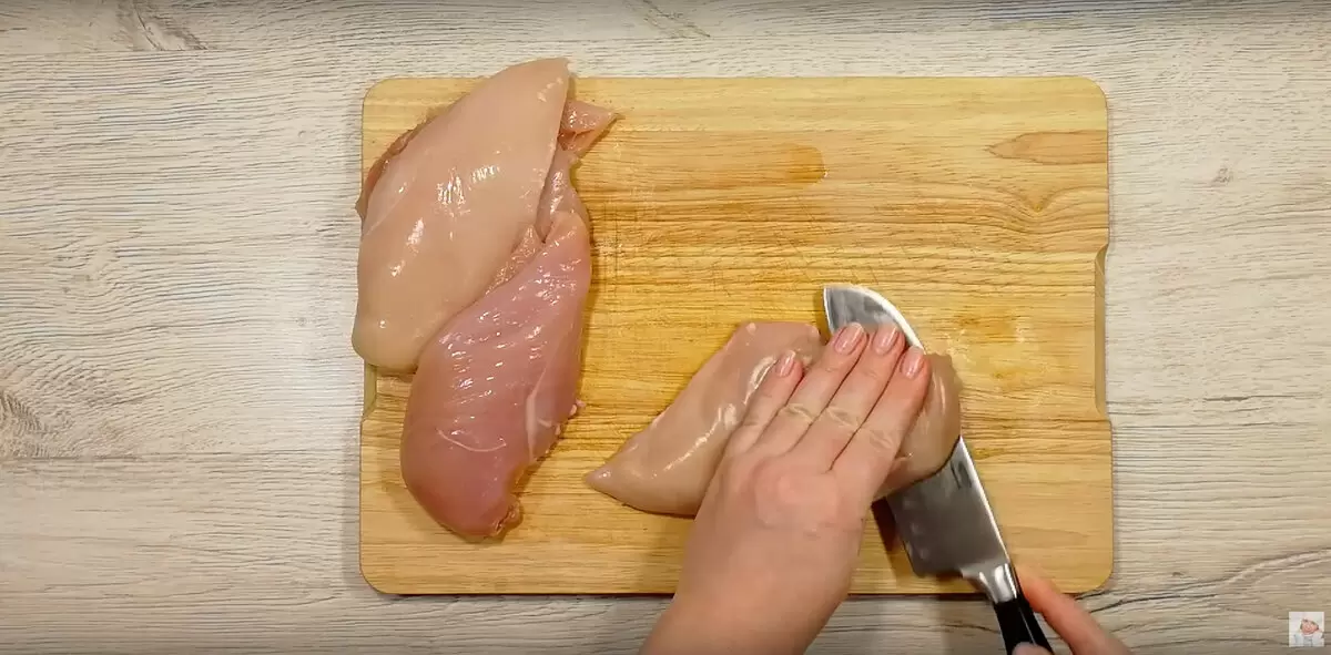 Для начала куриные филе необходимо разрезать пополам, а затем накрыть пленкой и аккуратно отбить молотком до получения тонких пластов. После этого мясо следует поперчить и посолить, не забыв добавить немного горчицы для обогащения вкуса.