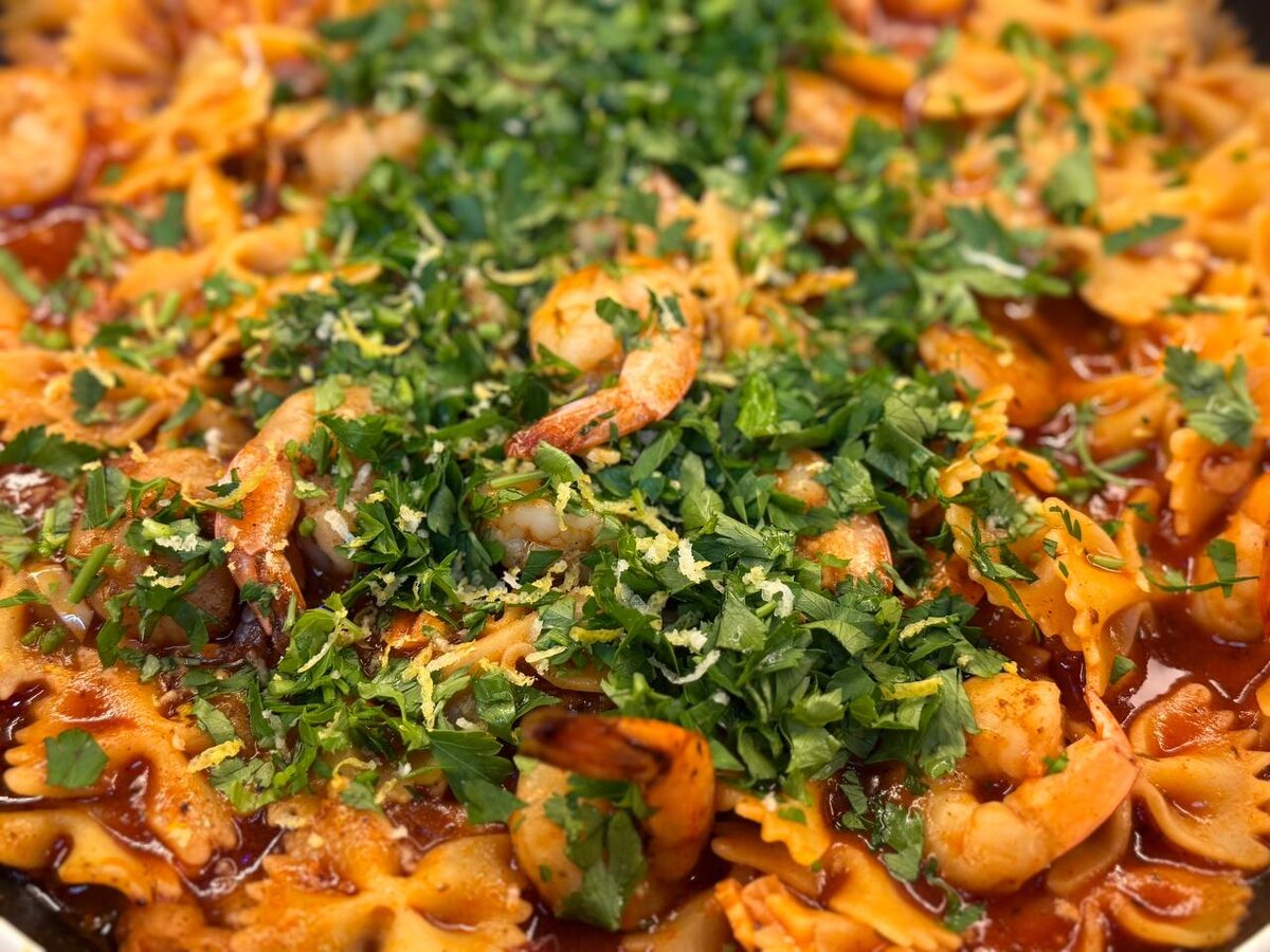 Тщательно разморозить креветки, очистить их, удалить хвостовые жилки и обсушить.На плите закипятить воду для пасты и разогреть сковороду для приготовления креветок.В сковороду добавить растительное масло и паприку, готовить около 30 секунд на среднем огне. Затем выложить креветки в один слой.Когда креветки начнут розоветь, перевернуть их, добавить коньяк и дать ему испариться.Пока готовятся креветки, следует бросить пасту в кипящую воду и сварить её на одну минуту меньше, чем указано на упаковке.Добавить к креветкам нарезанные помидоры, орегано, тимьян и сахар. При желании, можно добавить немного соли.Как только томаты закипят, перенести готовую пасту в сковороду с креветками, стараясь оставить часть воды из кастрюли.Посыпать все мелко нарезанным чесноком и тщательно перемешать, чтобы паста пропиталась соусом.Завершить блюдо рубленой петрушкой и, если есть желание, сбрызнуть соком лимона и посыпать цедрой.Такое восхитительное угощение точно украсит любой обед или ужин. За столом — настоящий ангел!