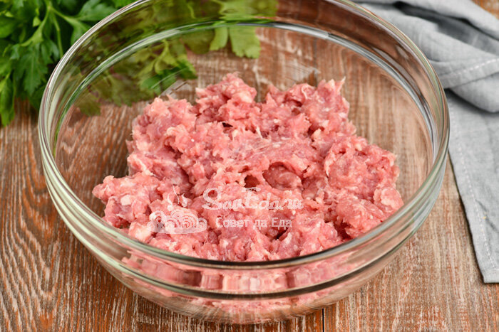 Для этого блюда подойдет любой фарш (600 г). Смешать фарш с солью, перцем, натертым луком и зеленью по вкусу. Затем собрать овощную смесь.