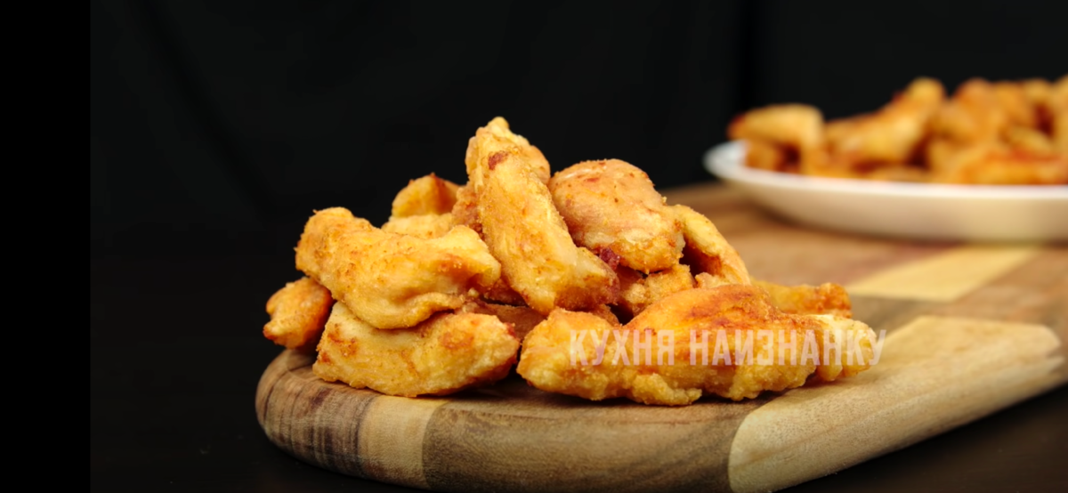 Теперь каждый кусочек обваливают в муке и выкладывают в сковороду с разогретым маслом. Рекомендуется использовать достаточное количество масла: так курица быстрее готовится, остается сочной, а ее объем формируется. Поразительно, но при обжарке кусочки практически не теряют своего размера!Рецепт в нескольких словах
