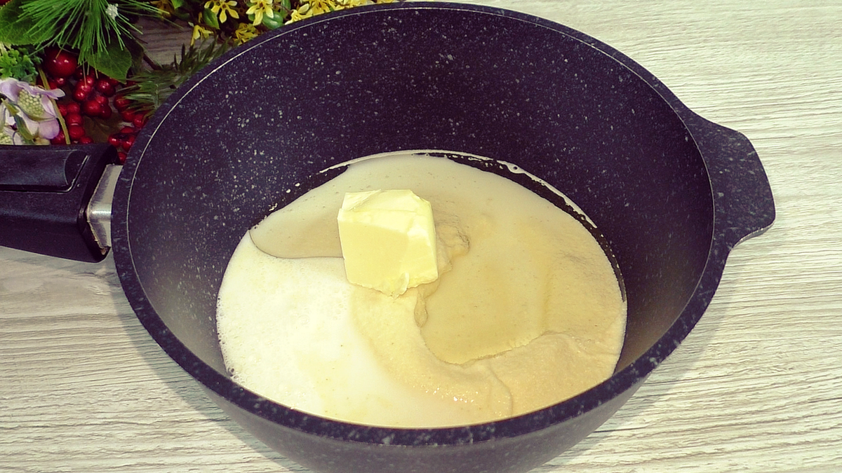 Начинать стоит с кастрюли, куда необходимо добавить манную крупу, щепотку соли, растительное и сливочное масло вместе с молоком. Ставим емкость на плиту, постоянно помешивая, готовим на огне, пока масло не растворится. Процесс займёт всего 2-3 минуты, в итоге получится густая манная каша.