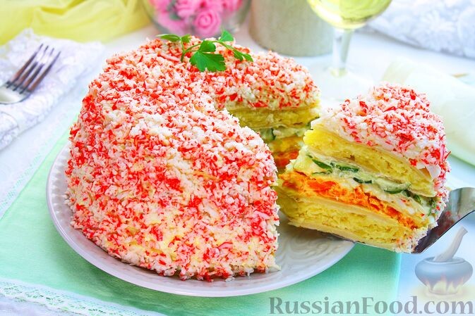- Закусочный блинный торт: из ярких блинчиков с крабовыми палочками, картофелем, морковью и свежим огурцом, этот торт станет настоящим centerpiece вашего стола.