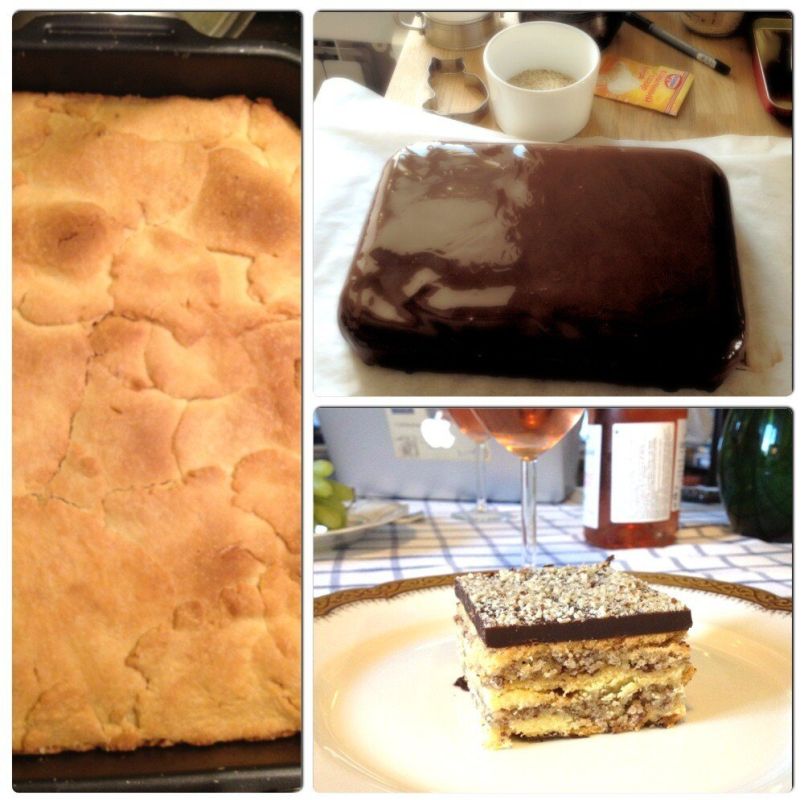 Отделите желтки от белков и поместите белки в холодильник. Растопите маргарин и смешайте желтки с 3/4 стакана сахара. Затем аккуратно введите теплый маргарин и добавьте муку. Замесите тесто, разделив его на три части (одна из которых должна быть немного больше). Уберите в холодильник на 1 час.Раскатайте одну из меньших частей теста и разместите в форме для выпечки. Испеките корж при температуре 180°C до золотистой корочки. После выпечки переверните на доску.Взбейте 4 белка с 3/4 стакана сахара до образования густой пены. Добавьте орехи и готовьте второй меньший корж с бортиками в форме. Выложите на него половину смеси из белков и орехов, накройте испеченным коржом, затем добавьте оставшиеся белки с орехами.Из оставшейся части теста сформируйте маленькие лепешки и равномерно распределите их по поверхности белков, чтобы создать «панцирь». Это позволит тесту приподняться, когда белки будут подниматься. Отправьте в духовку на 40 минут при 180°C.После приготовления переверните торт на доску. Охладите и полейте шоколадной помадкой, приготовленной из стакана сахара, яйца, какао-порошка, масла и молока, тщательно варите на небольшом огне в течение 5 минут. Украсить можно орехами, цукатами или любыми другими любимыми добавками.