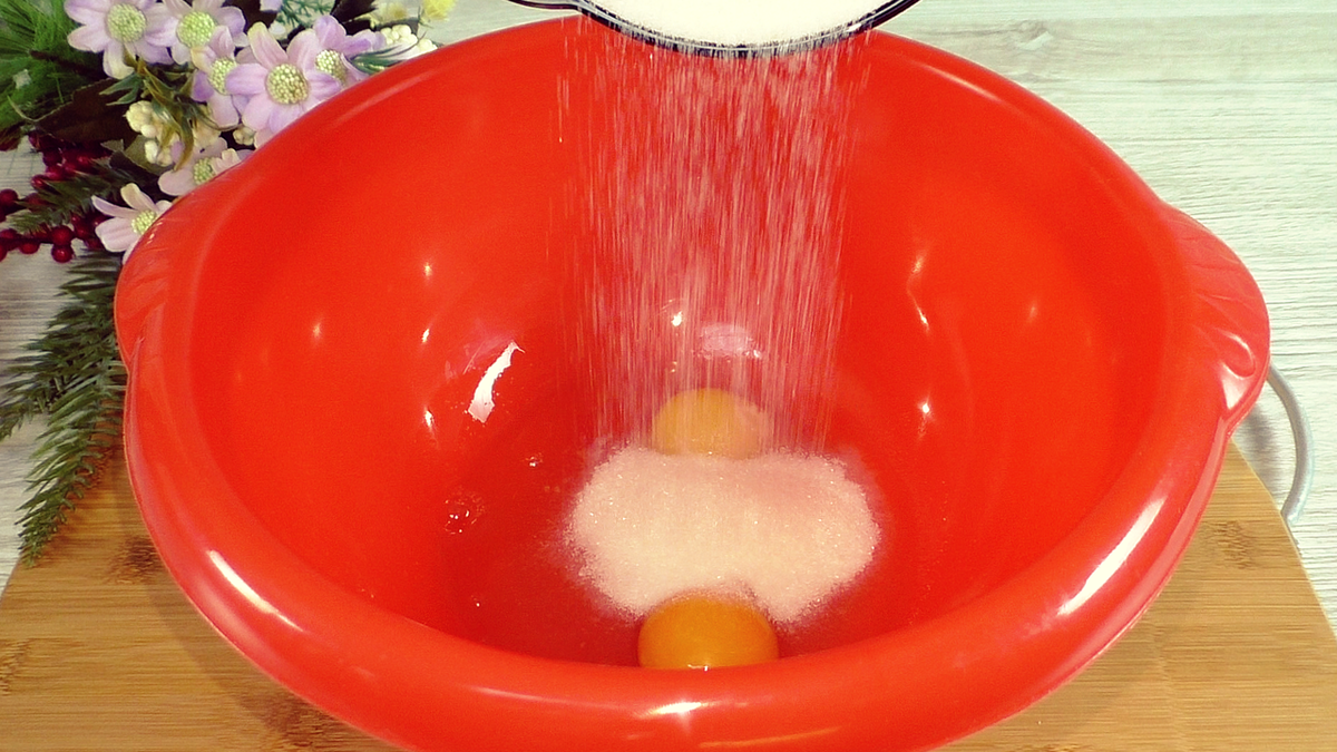 В глубокой миске соедините яйца, сахар и щепотку соли. При желании добавьте ванилин или ванильный сахар. Затем влейте растительное масло и добавьте цедру цитрусовых, если хотите. Далее, постепенно вводите муку, смешанную с разрыхлителем, и замешивайте тесто. В итоге у вас должно получиться нелипкое тесто, которое весит около 550 г.