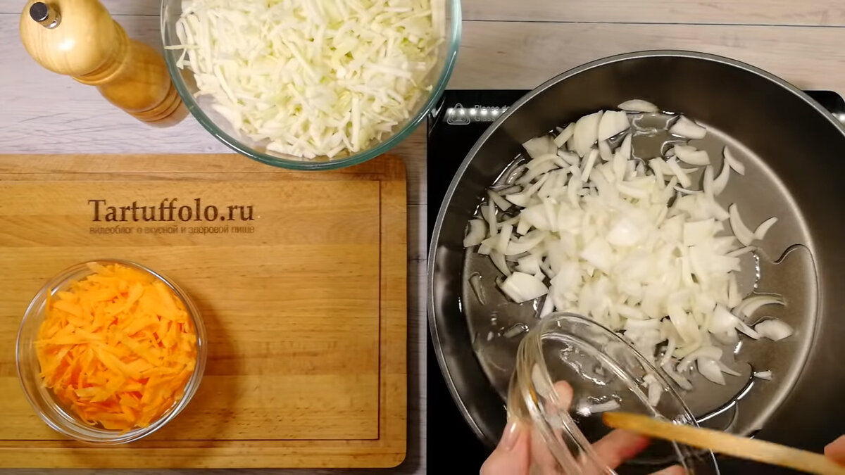Всё начинается с обжаривания одной луковицы на раскалённой сковороде. Затем к ней добавляем натёртую морковь и продолжаем обжаривать пару минут до мягкости.