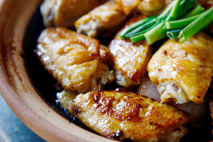 Имбирь нарезается тонкими пластинками, зеленый лук и болгарский перец — крупно, а репчатый лук — мелко.На куриных крылышках делаем небольшие надрезы. Перекладываем их в миску, добавляем соль, черный перец, устричный соус, половину нарезанного имбиря и зеленого лука. Перемешиваем и оставляем на 15 минут, чтобы мариновались.В отдельной миске тщательно перемешиваем ингредиенты для соуса.На хорошо разогретой сковороде с добавлением растительного масла обжариваем крылышки с обеих сторон до золотистого цвета.В глиняном горшке или небольшом казанчике на растительном масле обжариваем чеснок, белую часть зеленого лука, имбирь и репчатый лук до появления аромата. Затем добавляем болгарский перец.Сверху укладываем куриные крылышки и сбрызгиваем подготовленным соусом.Накрываем крышкой и тушим на среднем огне 10-15 минут, после чего блюдо готово.Приятного аппетита!