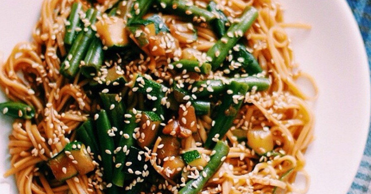 3. Параллельно с варкой лапши обжарьте нарезанные овощи на разогретом оливковом масле до легкой золотистости.