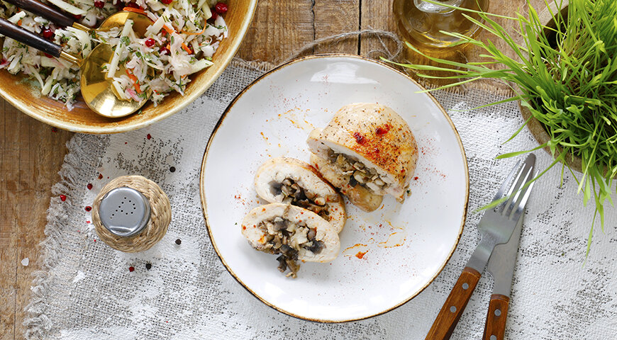 Очистите лук и чеснок, нарежьте их мелко. Обжарьте на сковороде в половине растительного масла в течение 7 минут на среднем огне. После этого немного остудите.Подготовьте шампиньоны: протрите их, нарежьте, особенно мелко – ножки, и обжарьте в оставшемся масле до полного выпаривания жидкости. Затем соедините с луком и чесноком.Разогрейте духовку до 120°C. Отделите малое филе от куриной грудки, приправьте большое филе солью и перцем со всех сторон.Измельчите малое филе в фарш. Смешайте его с грибной начинкой, приправив солью и перцем.Отрежьте кусок пищевой пленки размером 40 на 30 см. Смажьте центр сливочным маслом и уложите куриное филе "кожей" вниз. Выложите на него грибную начинку.Поднимите края пленки, закрутите их, сформировав "пакетик". Отрежьте длинный "хвост" пленки и выложите все на противень, застеленный пергаментом. Запекайте в течение 30 минут.После готовки выложите курицу на тарелку, накройте листом фольги (не заворачивая полностью!) и дайте постоять 5-7 минут. Перед подачей снимите пленку и посыпьте блюдо копченой паприкой.