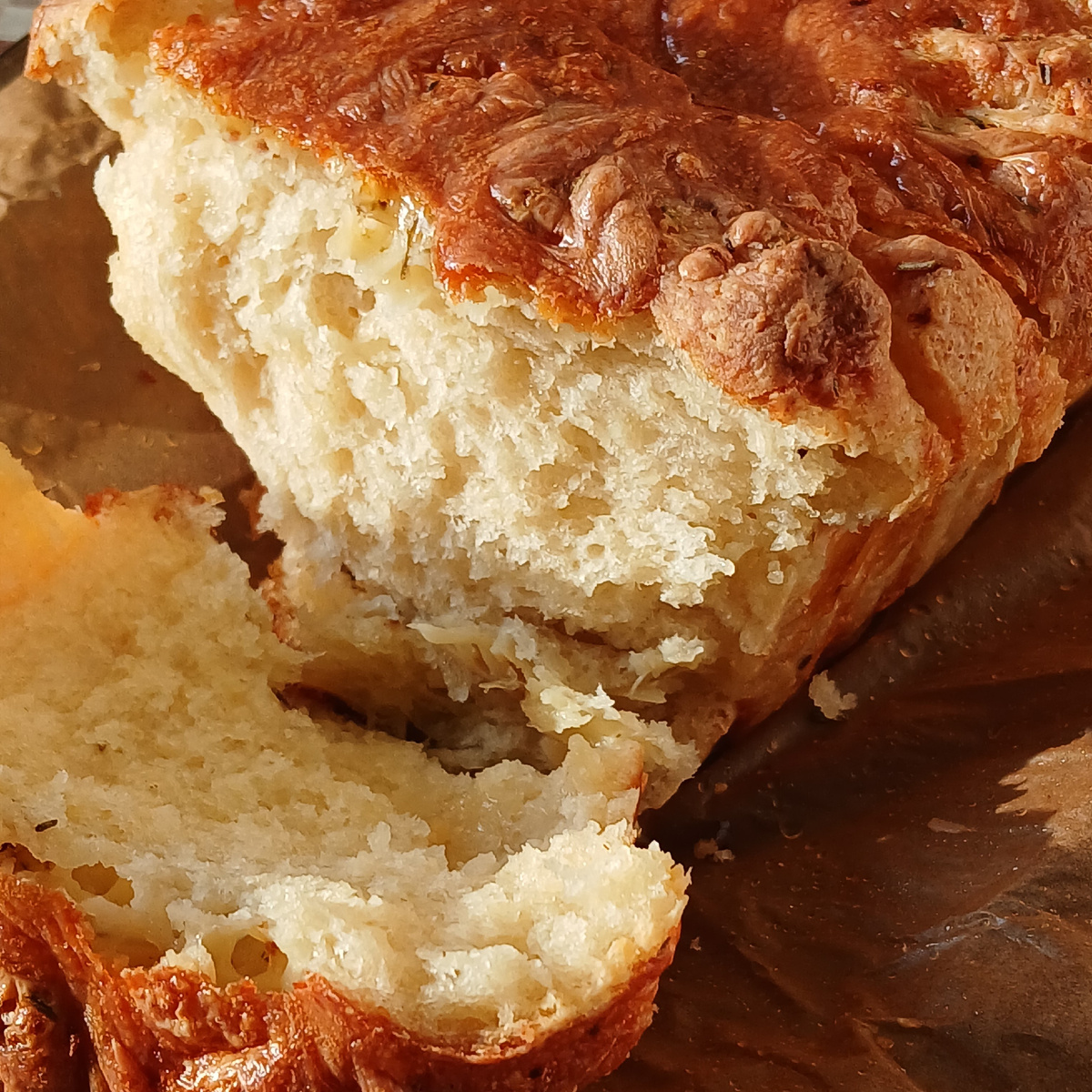 3. Формирование и выпечка: Когда тесто подойдет, обомните его и раскатайте в квадрат. Нанесите чесночное масло и посыпьте натёртым сыром. Разрежьте тесто на квадраты и уложите в смазанную форму для кекса. Выпекайте в разогретой до 180°C духовке около 40 минут до золотистой корочки.