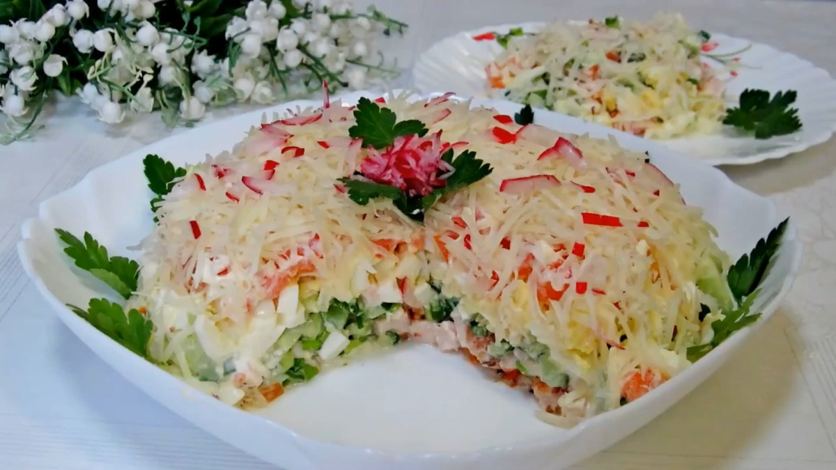 Салат лучше подавать сразу после приготовления, чтобы сохранить его свежесть и ауру весеннего настроения. Гости обязательно оценят этот вкусный и удобный вариант для любого стола!