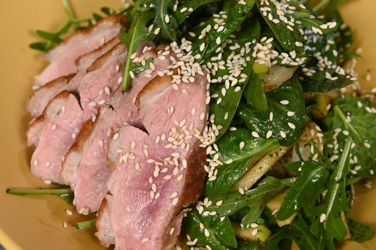 6. Готовую утку нарезать слайсами и выложить на тарелку с заправленным салатом. Сверху украсить слайсами утиного филе и посыпать обжаренным кунжутом.