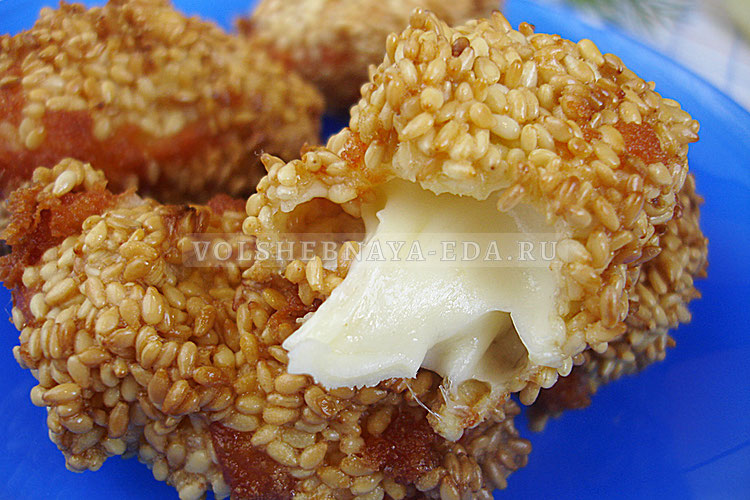 Теперь стоит «одеть» каждый кусочек сыра. Обваляйте его в муке, затем окуните в яичную смесь и посыпьте кунжутом. Для большей надежности процесс обсыпки можно повторить: снова окунуть в яйцо и завернуть в кунжут.
