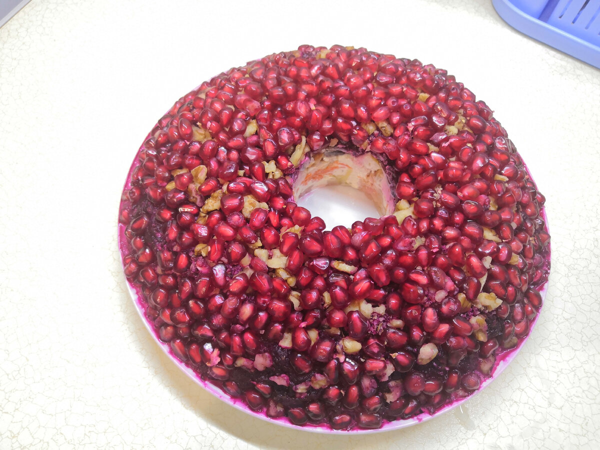 Завершающий штрих — свекла, измельченные грецкие орехи и зерна граната, которые следует слегка вдавить в верхний слой. Салат помещают в холодильник на пару часов, а при подаче стакан убирается, открывая великолепный «Гранатовый браслет».
