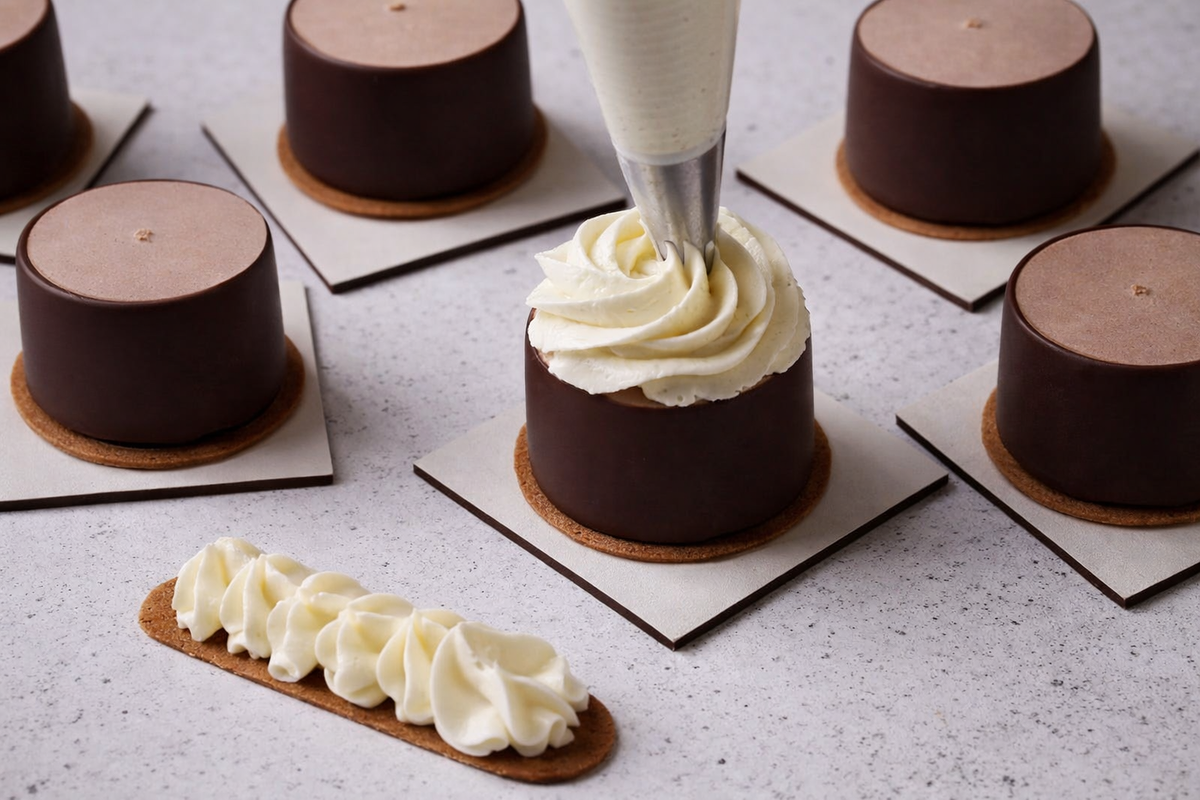 Взбитый творожный ганаш предлагает сливочный и деликатный вкус с легким творожным освежением, а его текстура остается пластичной и удобной для работы. Этот ганаш обладает исключительной универсальностью, позволяя использовать его как в качестве украшения, так и в качестве основного слоя в десерте.