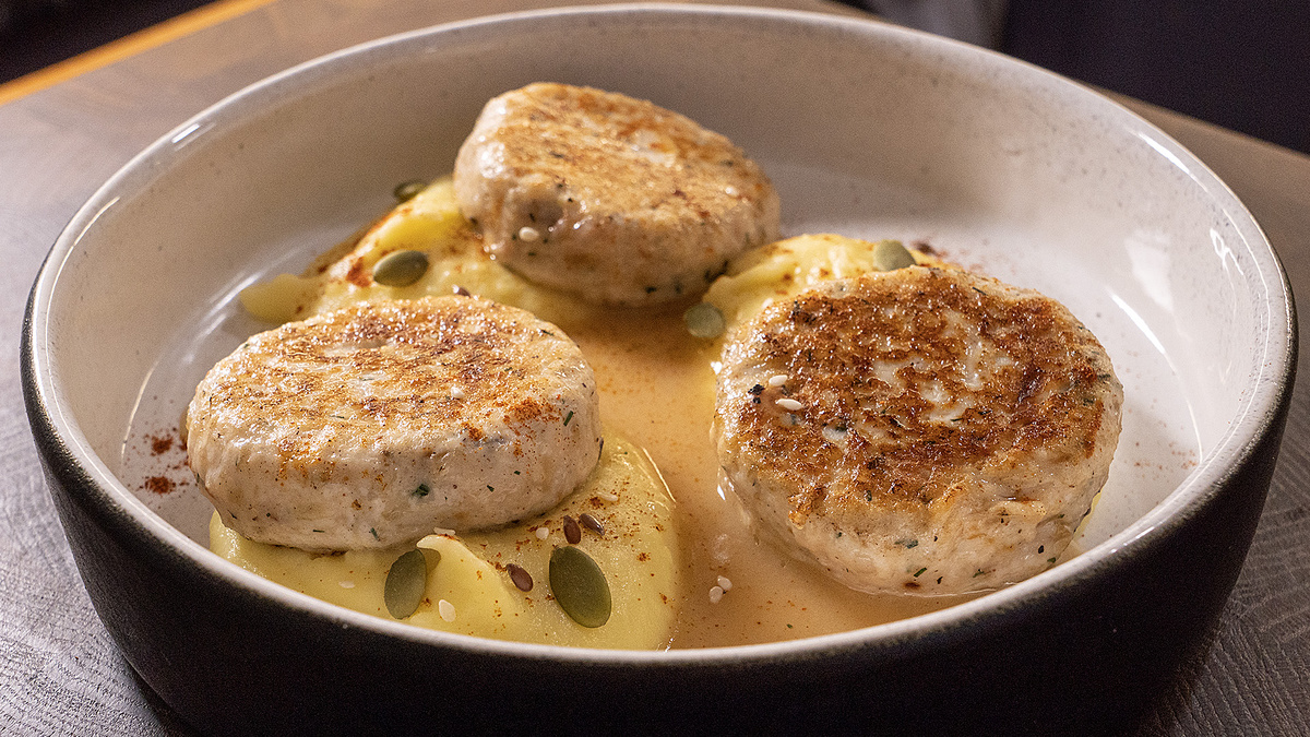 Предлагаем вам насладиться тёплым домашним ужином с великолепной комбинацией куриных котлет, пюре и изысканного соуса с тимьяном. Эти мягкие и сочные котлеты, в которых аккуратно переплетаются ароматы копчёного бекона и свежего укропа, станут настоящим украшением любого стола.