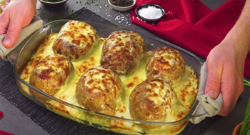 Поместив фаршированные половинки на смазанный маслом противень, их нужно щедро полить сметаной. Запекание не только придаст картофелям аппетитный вид, но и сделает их невероятно нежными внутри. Для чего-то необычного, можно добавить тертый сыр. Это придаст блюду золотистую корочку и особый вкус.
