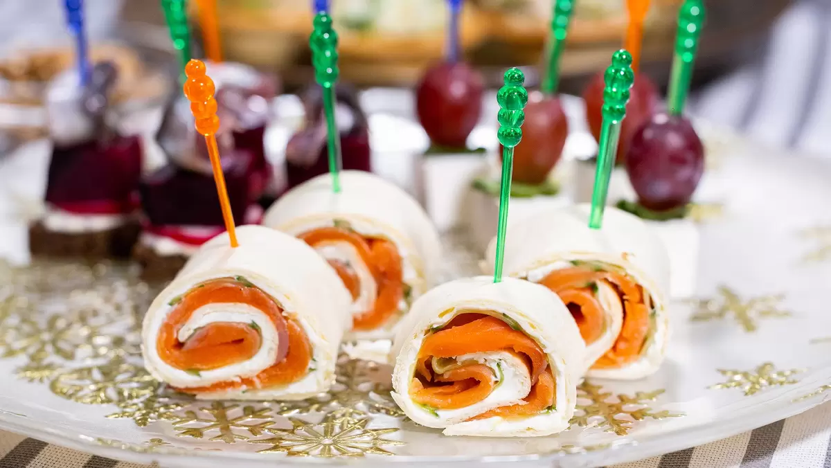 3. Скрутить тортилью в плотный рулет и проткнуть его деревянными шпажками, чтобы всё держалось вместе. Это не только удобно для сервировки, но и придаёт канапе стильный вид.