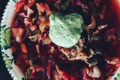 Для начала в большой кастрюле сварить бульон, используя 5 литров воды на 2 кг телячьих костей. Чтобы бульон был более насыщенным, лучше запечь кости в духовке при 180 градусах в течение часа.В бульон добавить лук, морковь, сельдерей и имбирь. Варить полтора часа, периодически снимая пену. В конце добавить лавровый лист, вино и черный перец, и продолжать варить еще полчаса.Тем временем подготовить овощи: нарезать свеклу, картошку и морковь кубиками, мелко порезать лук и помидоры, нашинковать капусту. Все ингредиенты раскладываются по разным емкостям.В другой кастрюле на разогретом растительном масле обжарить лук до мягкости, затем добавить морковь и свеклу. Готовить 15 минут, после чего добавить помидоры. Когда они размягчатся, добавить аджику и капусту, продолжая тушить.В добавочный бульон высыпать картошку, довести до кипения и варить на медленном огне до готовности. За несколько минут до окончания добавить мелко нарезанные укроп и петрушку, а также чеснок.Для зеленого соуса в блендере смешать оливковое масло, сметану, зеленый лук, лимонный сок и горчицу до однородной массы.Борщ подавать с густым зеленым соусом и наслаждаться его уникальным вкусом, который никого не оставит равнодушным!