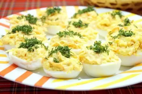 Эти удивительно простые фаршированные яйца с сыром готовы к подаче! Они идеально подойдут как для праздничного ужина, так и для обычного семейного обеда. Наслаждайтесь!