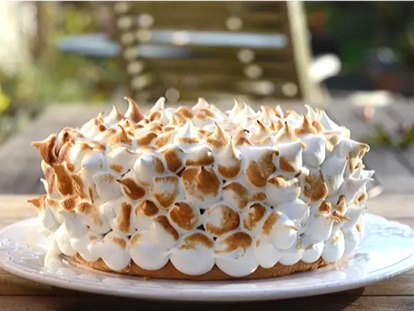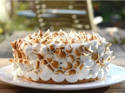 Когда бисквит остынет, разрежьте его на три коржа. На первый корж выложите половину лимонного крема, накройте вторым слоем и добавьте оставшийся крем. Завершите сборку третьим коржом, а затем обильно покройте тортик меренгой. Используя паяльную лампу, аккуратно карамелизуйте поверхность меренги до золотистой корочки. Если паяльной лампы нет, можно использовать режим гриля в духовке.