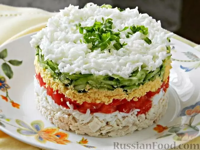 Слоёный салат с курицей, помидорами, огурцами и яйцами привлекает внимание не только вкусом, но и внешним видом. Разноцветные слои выглядят впечатляюще и прекрасно сочетаются друг с другом, создавая настоящую кулинарную картину.