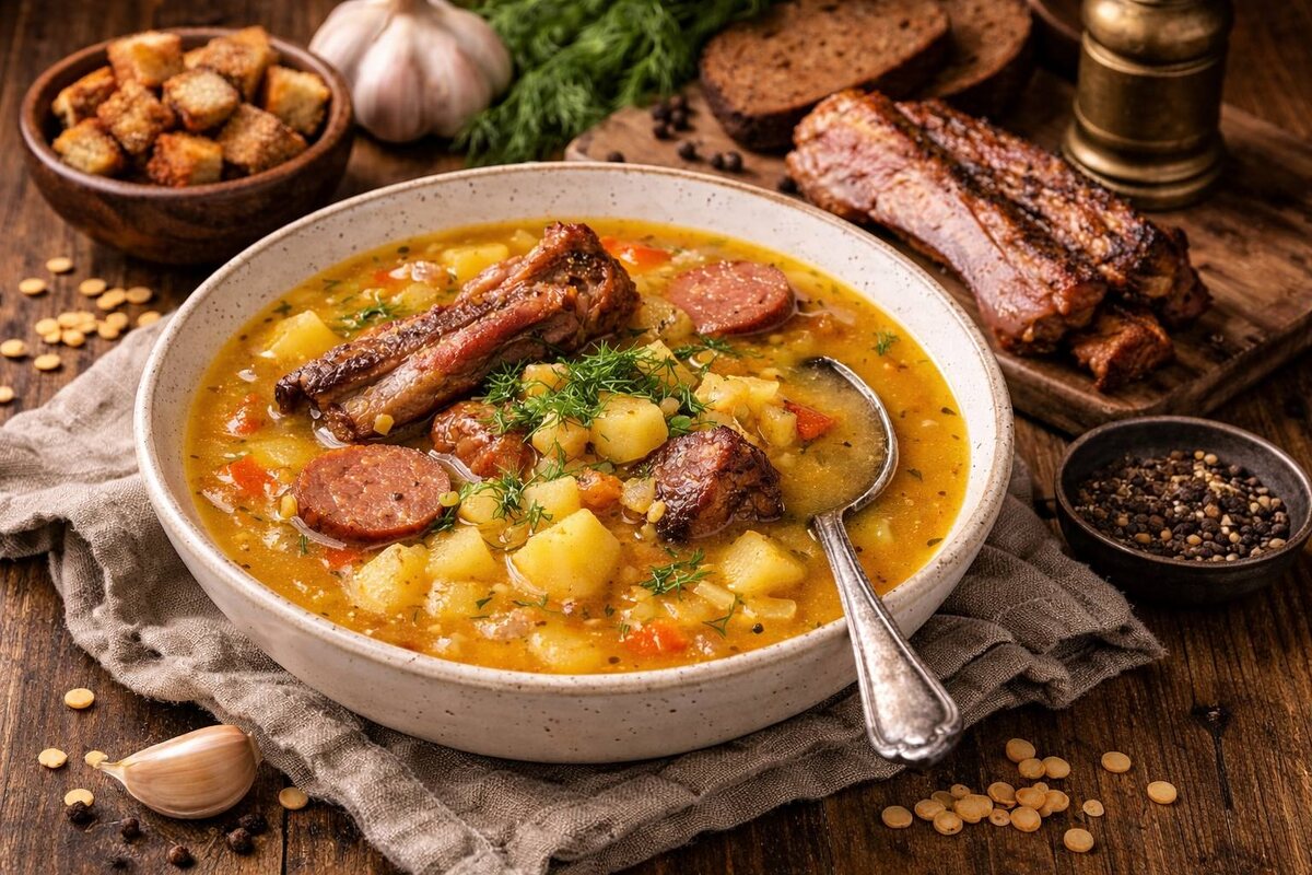 Гороховый суп с копчёностями — идеальное решение для быстрого и уютного семейного ужина. Он не только радует своим ароматом, но и создает ту самую атмосферу, когда все собираются вместе.