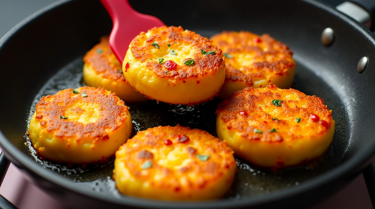 Если масса кажется слишком жидкой, к ней добавляется 3-4 столовые ложки крахмала, чтобы добиться нужной консистенции. С помощью ложки для мороженого формируются небольшие котлеты, которые затем обжариваются на разогретой сковороде, смазанной растительным маслом. Котлеты поджариваются до золотистой корочки с обеих сторон.
