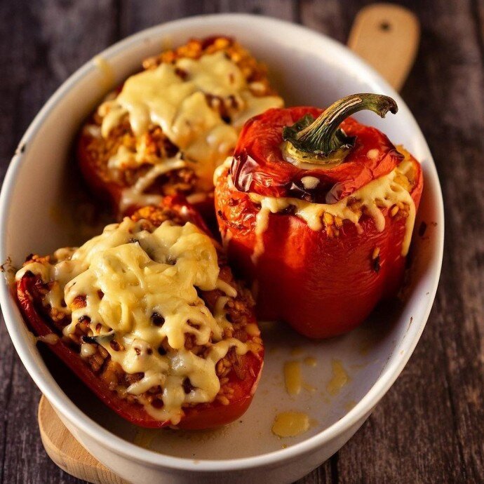 Когда перцы будут готовы, аккуратно посыпьте их натертым сыром и верните в духовку еще на несколько минут, чтобы сыр расплавился и подрумянился. Вот и всё — ароматные фаршированные перцы готовы!